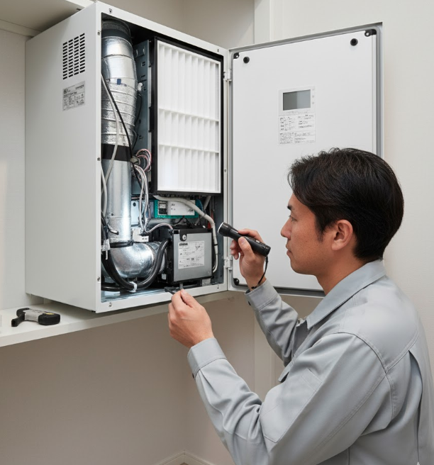 点検では、フィルターの汚れ具合や、モーターの異音、給排気の流れが正常かどうかがチェックされます。